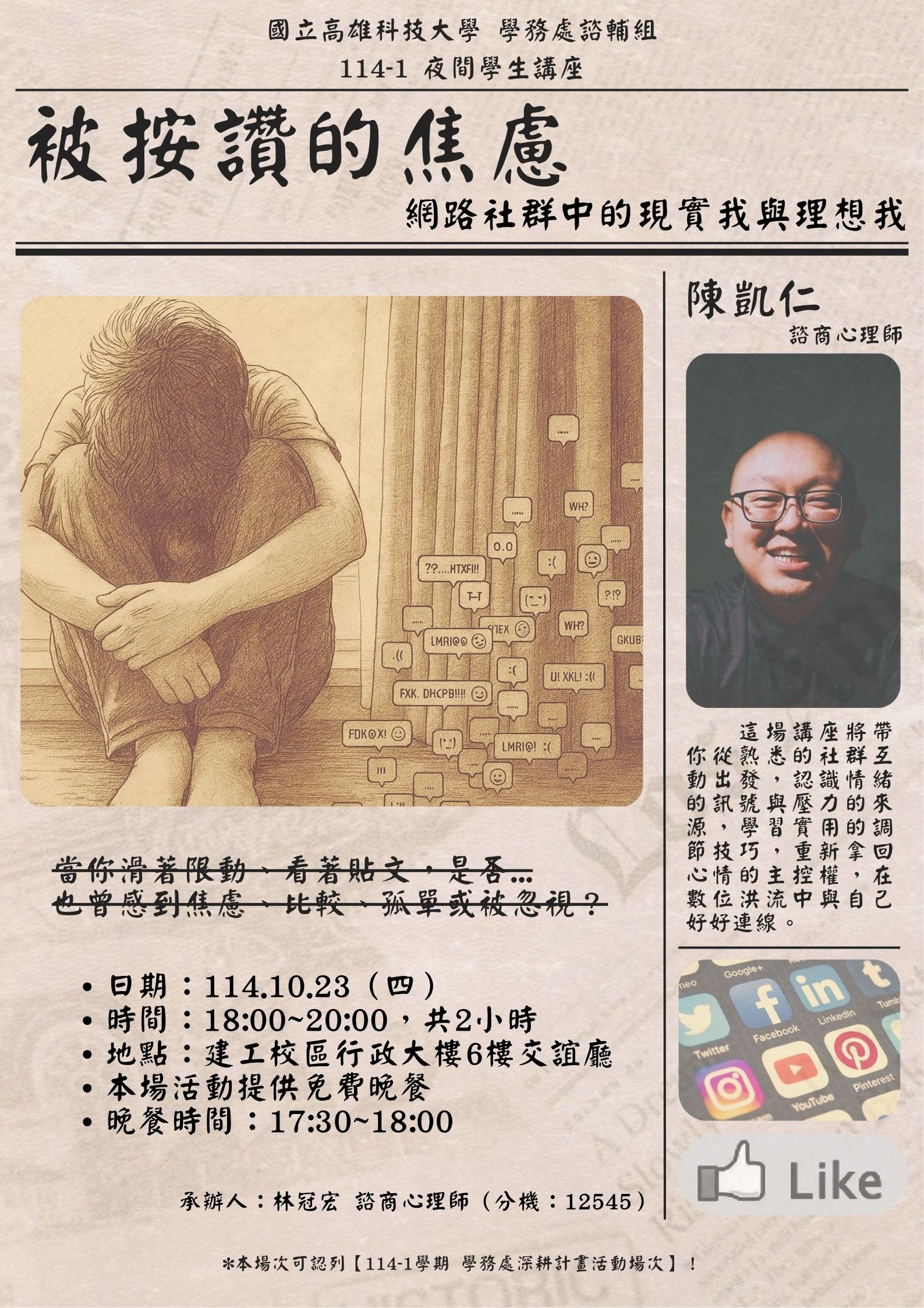 報名通知--【114-1諮輔組深耕認列講座】社群焦慮解方|免費供餐、深耕認列