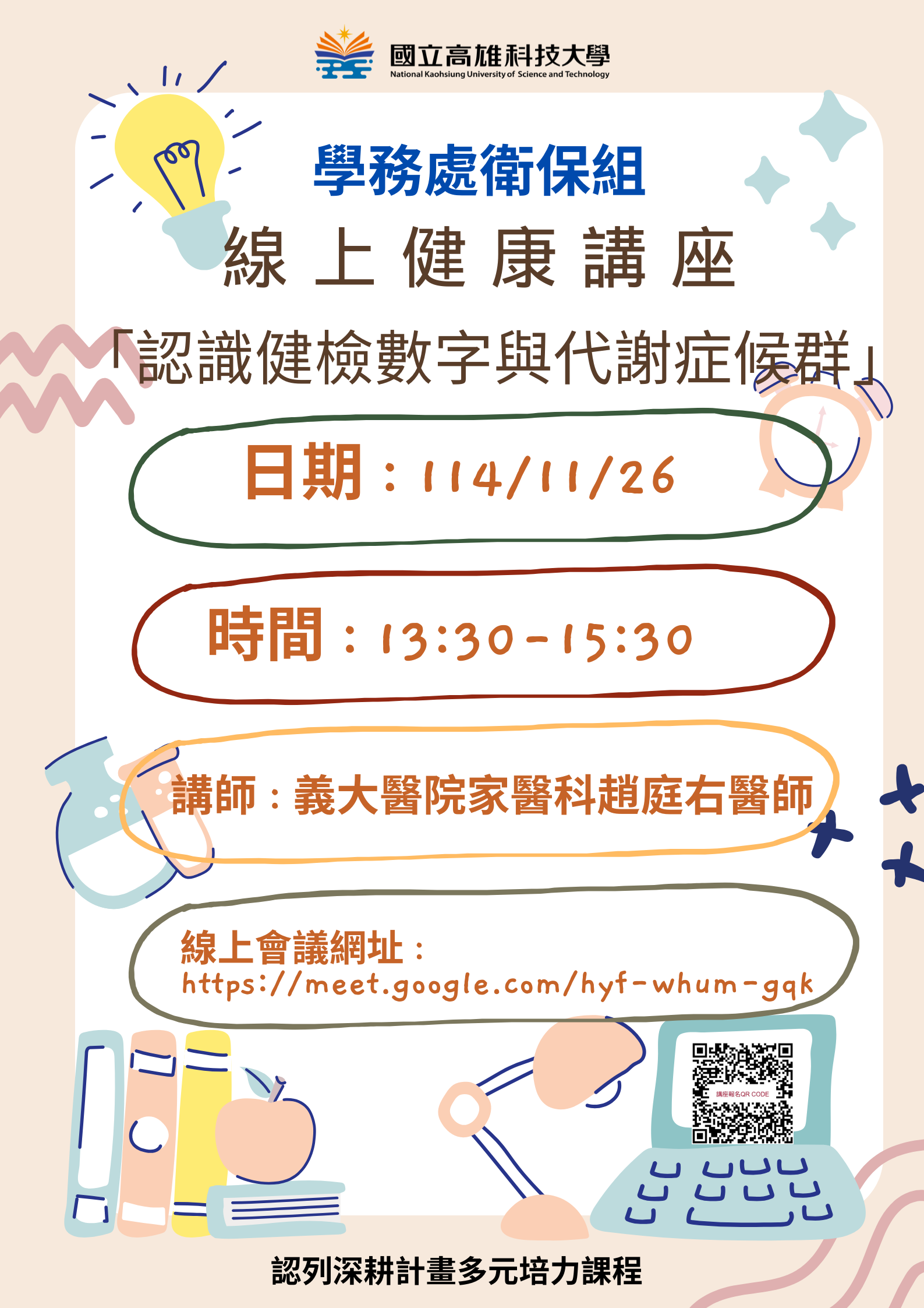 研習通知--衛保組114年11月26日(三)13:30-15:30辧理「認識健檢數字與代謝症候群」 線上健康講座,認列學務處深耕計畫多元增能培力課程與教職員學習時數, 敬請踴躍報名參加。