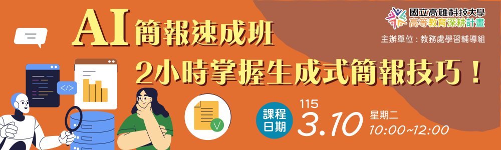 高科大學輔組特別邀請李燕秋老師,帶來【生成式簡報應用】課程,教你如何運用 AI 快速打造專業簡報。
