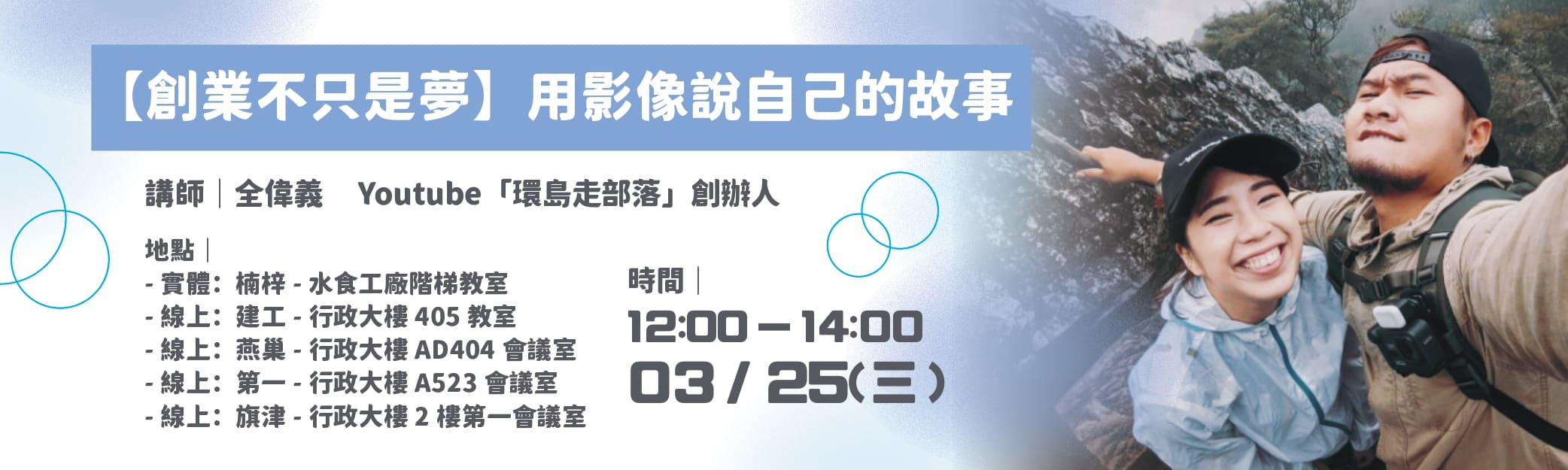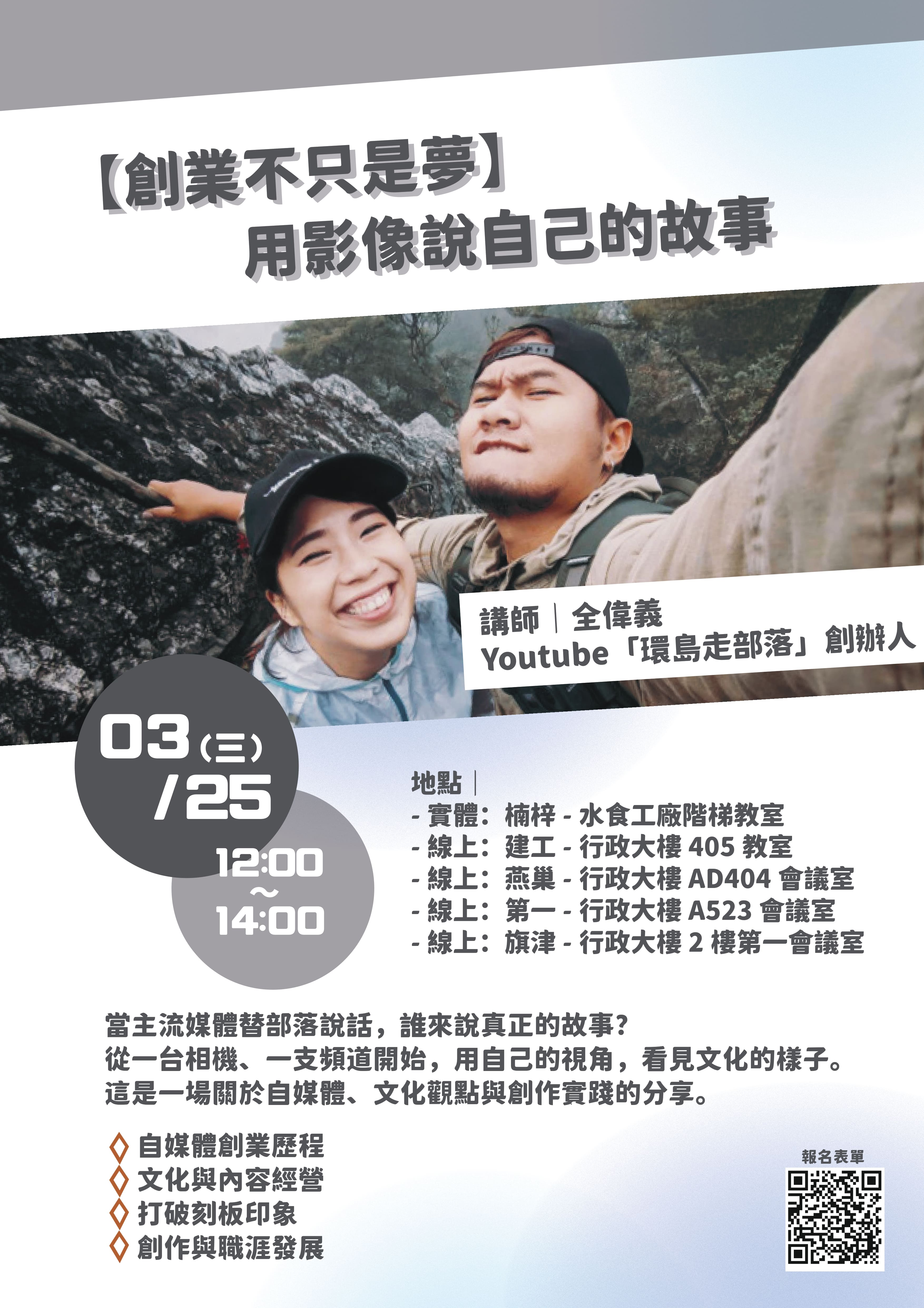 第二場次:03/25創業不只是夢—用影像說自己的故事(https://reurl.cc/MMr5pk)