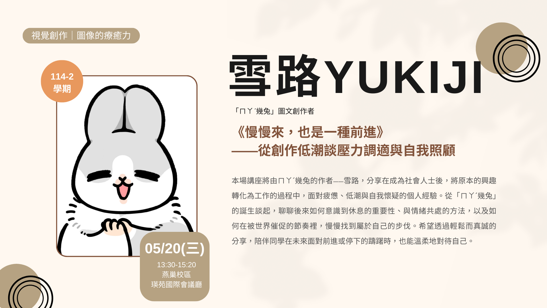 114-2 【高科人文講堂X大師開講】雪路YUKIJI - 《慢慢來,也是一種前進》 ——從創作低潮談壓力調適與自我照顧