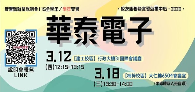 看更多第二期計畫A 2026-03-06【實習說明會】03.12(四)【建工校區】華泰電子「2026學年實習」實習暨就業媒合說明會 -