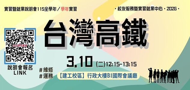 看更多第二期計畫A 2026-03-06【實習說明會】03.10(二)【建工校區】台灣高鐵「2026學年實習」實習暨就業媒合說明會 -