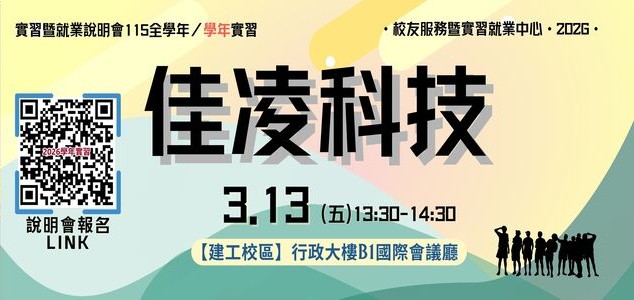 看更多第二期計畫A 2026-03-06【實習說明會】03.13(五)下午【建工校區】佳凌科技「2026學年實習」實習暨就業媒合說明會