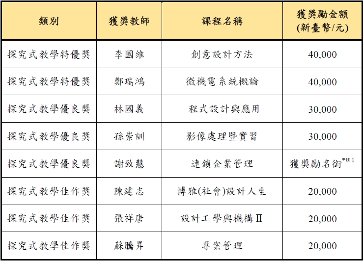 二、探究式教學獎勵名單如下表: