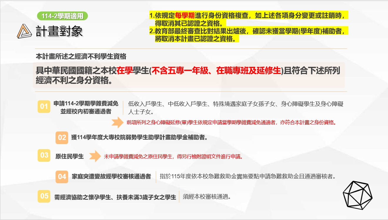 (1)申請114-2學期學雜費減免並經校內初審通過者:包含低收入戶學生、中低收入戶學生、特殊境遇家庭子女孫子女、身心障礙學生及身心障礙人士子女。