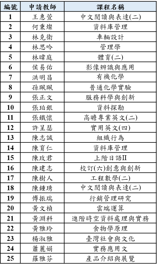 NEWS 最新消息 第二期計畫A 2026-03-02 公告事項--【公告】114-2學期「創新教學方法」核定補助名單 一、依據本校「教師教學創新補助與獎勵辦法」及115年度高教深耕計畫辦理。二、請注意補助經費需於本年(115)6月30日前核銷完畢。三、創新教學方法課程補助名單如下表:(依教師姓名筆劃排序) 公告信 23 Back回主頁