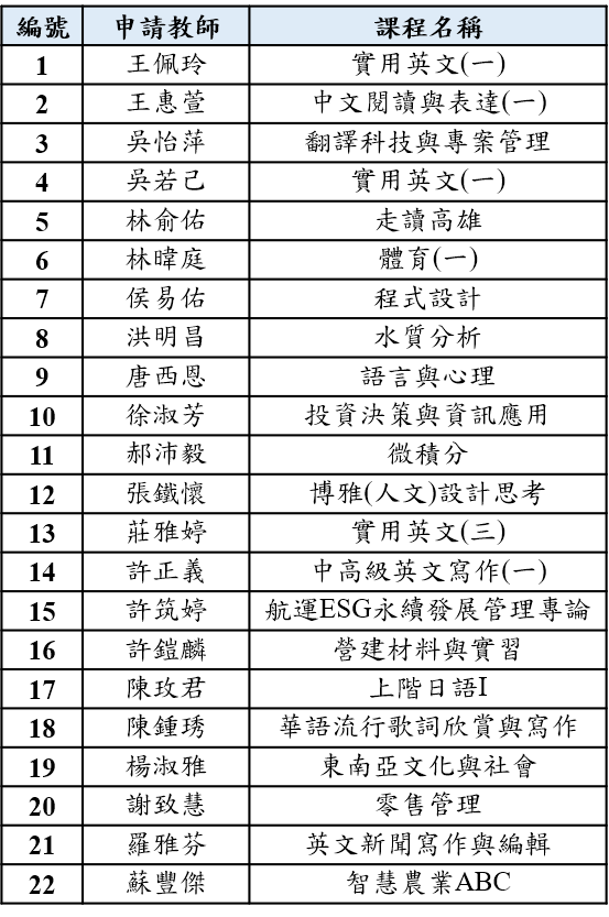 三、創新教學方法課程補助名單如下表:(依教師姓名筆劃排序)