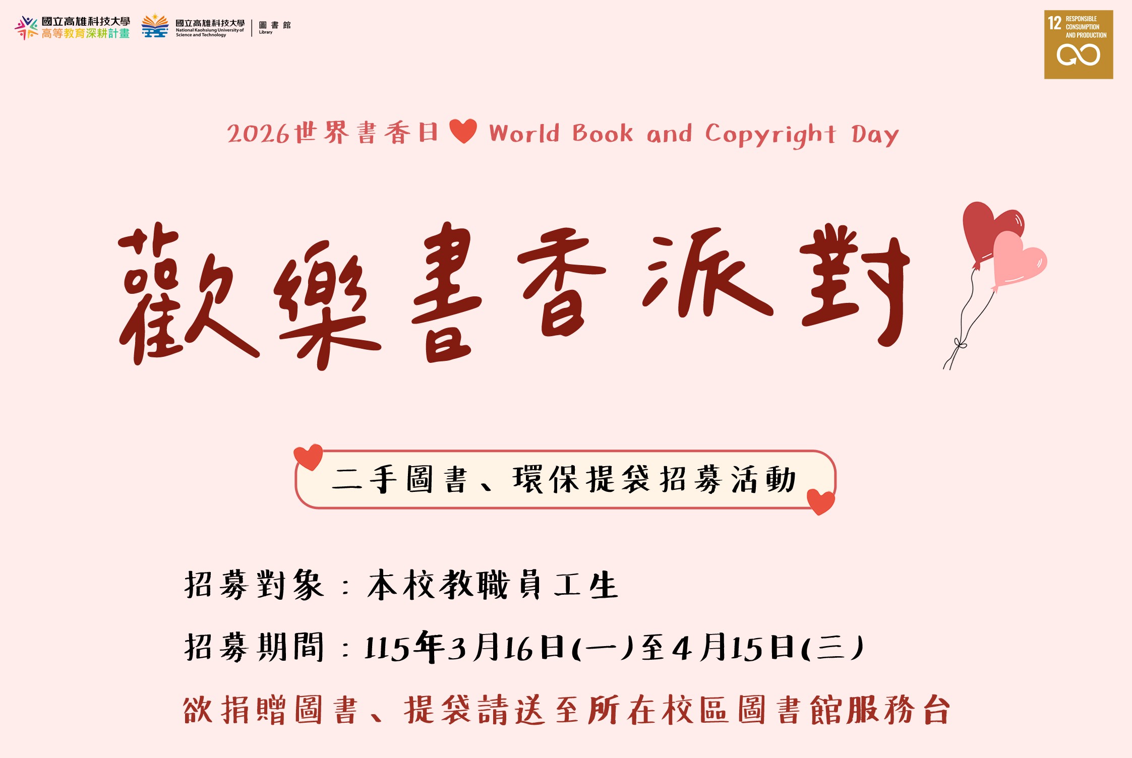 看更多第二期計畫A 2026-03-16⚡2026圖書館世界書香日|歡樂書香派對⚡二手圖書、環保提袋招募開跑囉,歡迎大家踴躍參加‼️ -